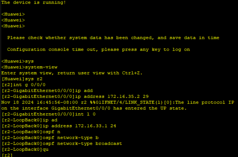 由于修改hello时间的配置思路与上面的"修改network-type类型"思路类似,所以这里就只展示R3-R1/2区域的修改配置指令,其余路由器配置同理,不做赘述
