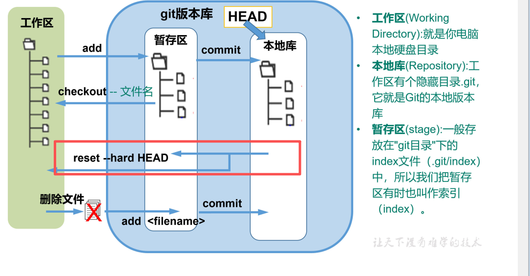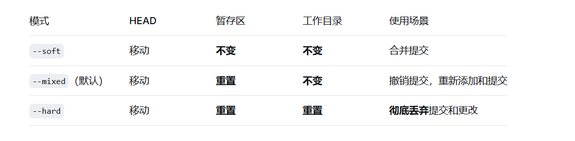 | 有改动,有add,无commit | Git reset (mixed) head 文件名 Git reset hard head文件名 可视化: git reset hard 文件名 Git -rollback | Git reset --mixed <commit>;默认模式,重置到暂存区,不碰触工作目录 根据情况,执行git checkout --文件名,回到工作区。 Git reset --hard <commit> 强硬回滚:并重置暂存区和工作目录。 |