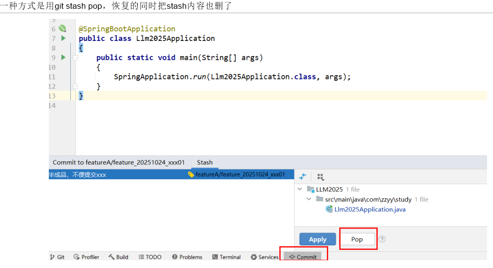 6.1)方案1:使用git stash apply恢复,但是恢复后,stash内容并不删除,需要使用git stash drop来删除。
