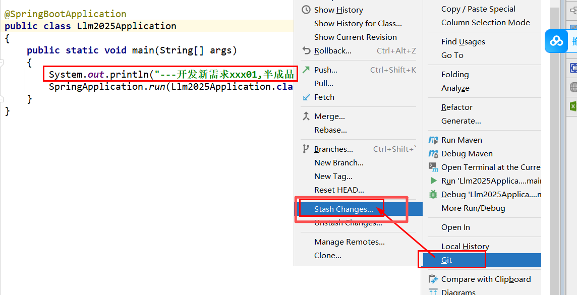 2.1)在feature分支选择git->stash changes ,进程暂存操作。