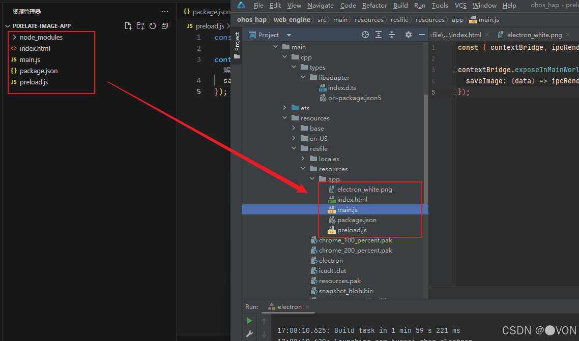 📁 资源打包机制 将 main.js, preload.js, index.html 打包进 HAP(HarmonyOS Ability Package)