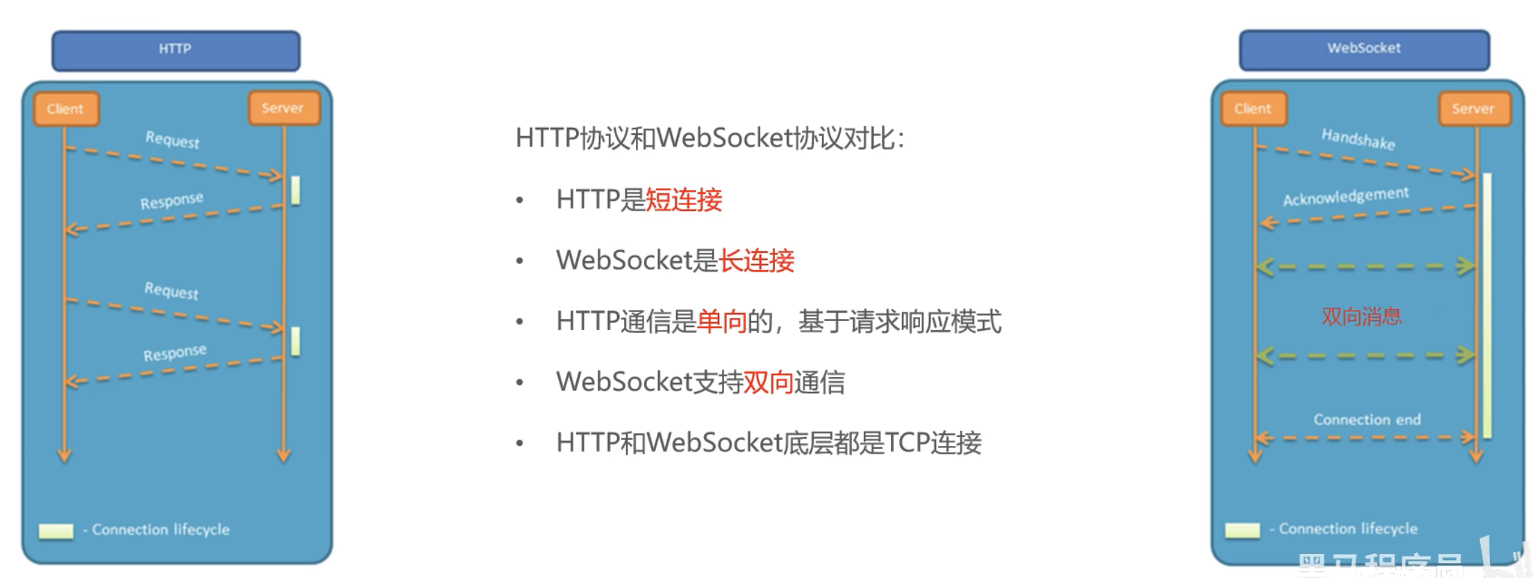 - WebSocket:一次握手建立连接后,双方可随时主动发送消息,直到连接关闭。