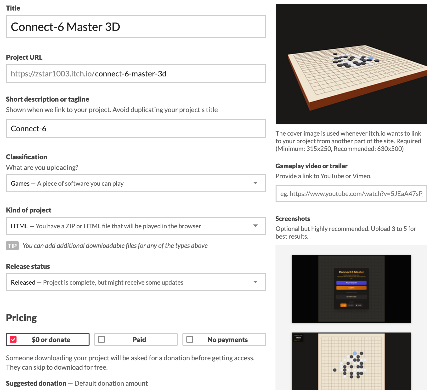 在itch上发布游戏非常简单,首先填写一些基本信息,包括游戏名称/分类/定价/介绍图等