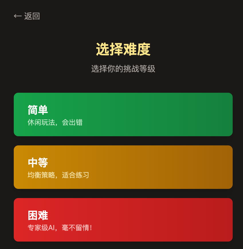 于是我进一步让AI帮我做了一下难度分级,原始难度为困难难度,增加简单和中等两档难度,降低玩家挫败感:
