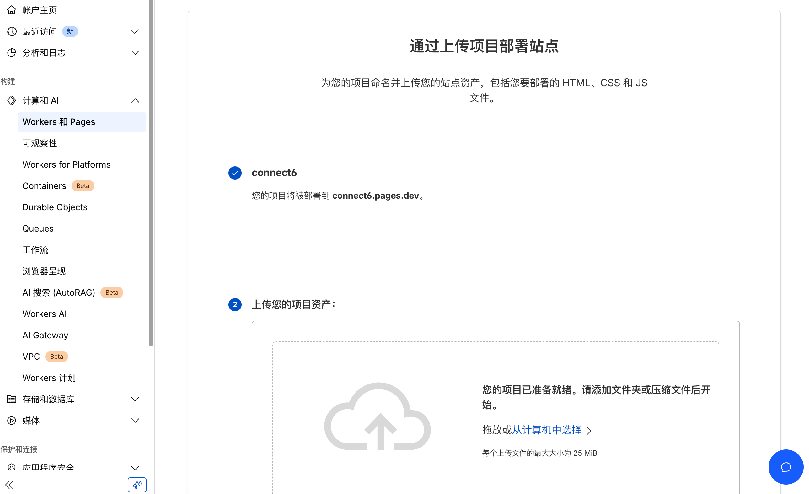 在cloudfare部署前端很简单,只需要在Pages里面上传构建完的dist文件就可以了。