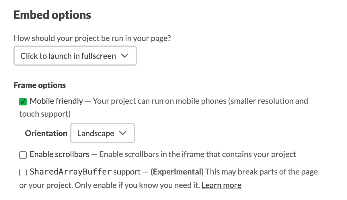此外,还有一些额外选项,比如游戏启动方式设置全屏启动,移动端方式选择横屏,这样电脑端和手机端都可以有较好体验效果。