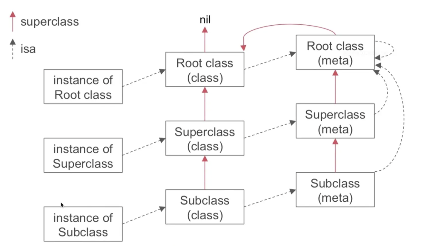实例对象的isa指向类对象,类对象的isa指向元类对象;元类对象的isa指向根元类对象,根元类对象的isa指向自己类对象与元类对象的superclass指向各自的父类,特别注意的一点是根元类对象的superclass指向根类对象。