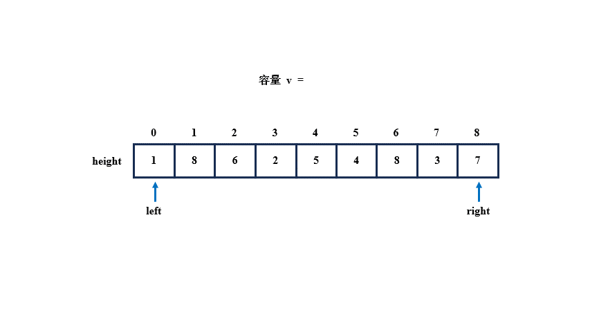 所以,我们可以设置两个指针 left 和 right,让 left 指向最左侧的数,让 right 指向最右侧的数,先通过 left 和 right 指向的两个数中的最小数(高度)以及下标之差(宽度)计算出一个容量保存起来,再比较 left 和 right 指向的值,若 left 指向的更小,left++,否则 right--,如果指向的值相同,则移动哪个都可以,因为小值的后方或前方可能有更大的值,所以让较小的移动,寻找更大的高度并继续计算容量,当容量比之前的大就进行更新,直到 left 与 right 相遇为止,就算出了最大容量