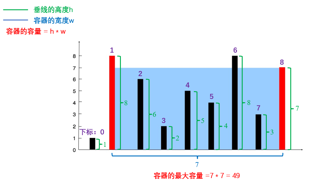 根据示例 1 给出的图片可知,两条垂线组成一个容器时,容器的高度 h 取最短的那一条,容器的宽度 w 取两条垂线对应的下标的差,容器的容量 v = 容器的高度 h * 容器的宽度 w