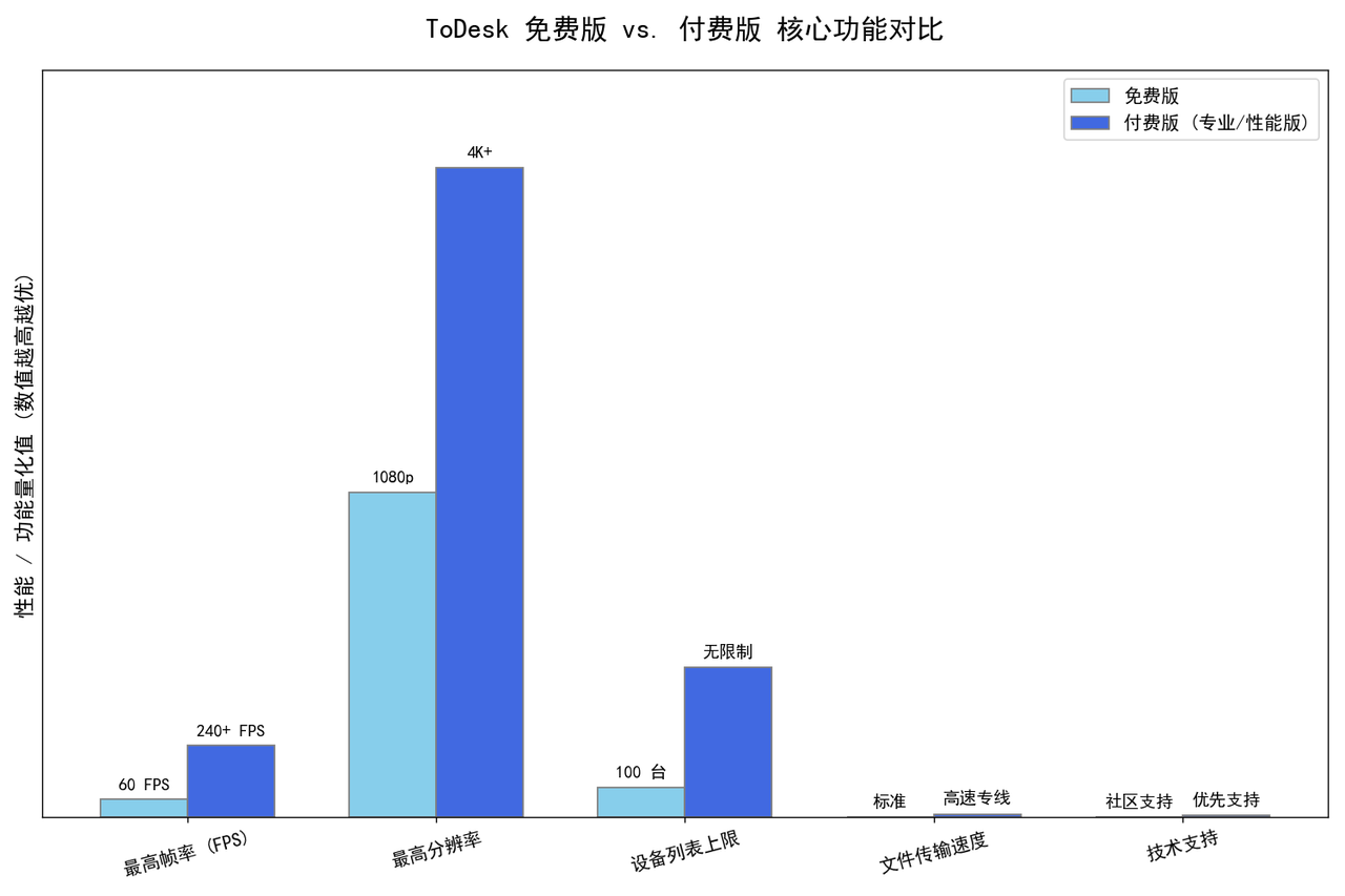 ToDesk采用了免费增值的商业模式。免费版提供了基础且完整的远程控制功能,足以满足大部分个人用户的轻度使用需求。然而,付费版则是在性能、功能和稳定性上的一次全面跃升,其价值主要体现在以下几个方面: