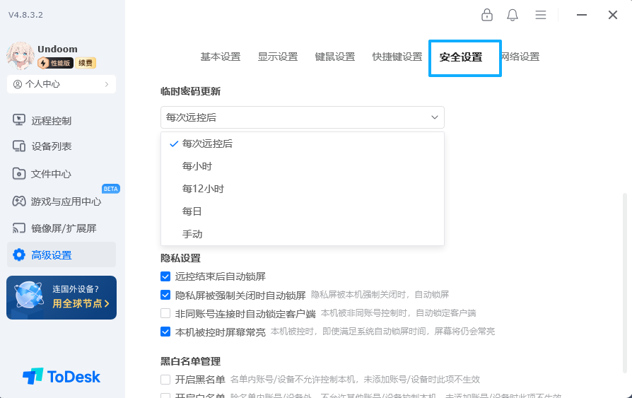 隐私与验证设置:在ToDesk的高级设置中,隐藏着一系列强大的安全控制开关,用户可以按需配置。