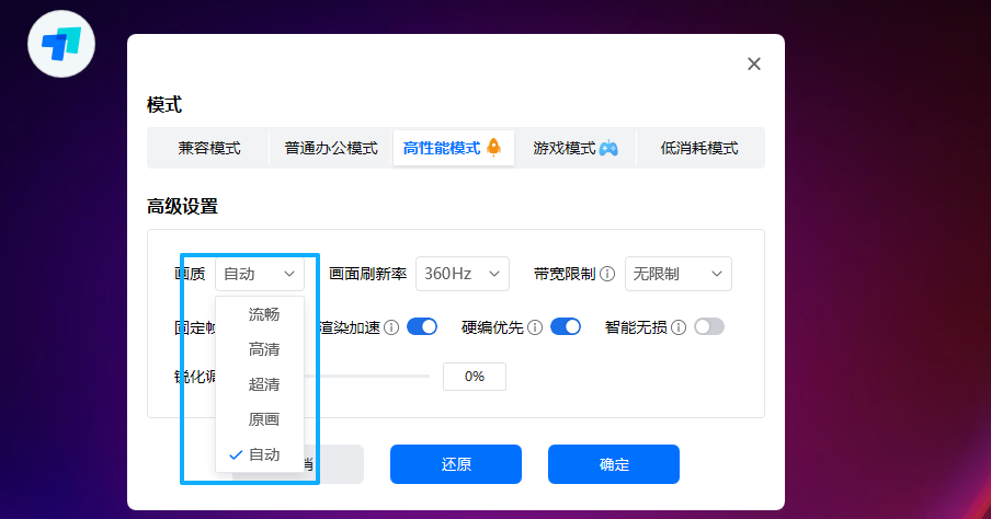 游戏/高性能模式+超清/原画画质:优先保证画面质量,以最高的清晰度传输屏幕内容,适合进行图形设计、视频审阅等对画质要求极高的工作。
