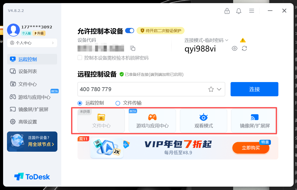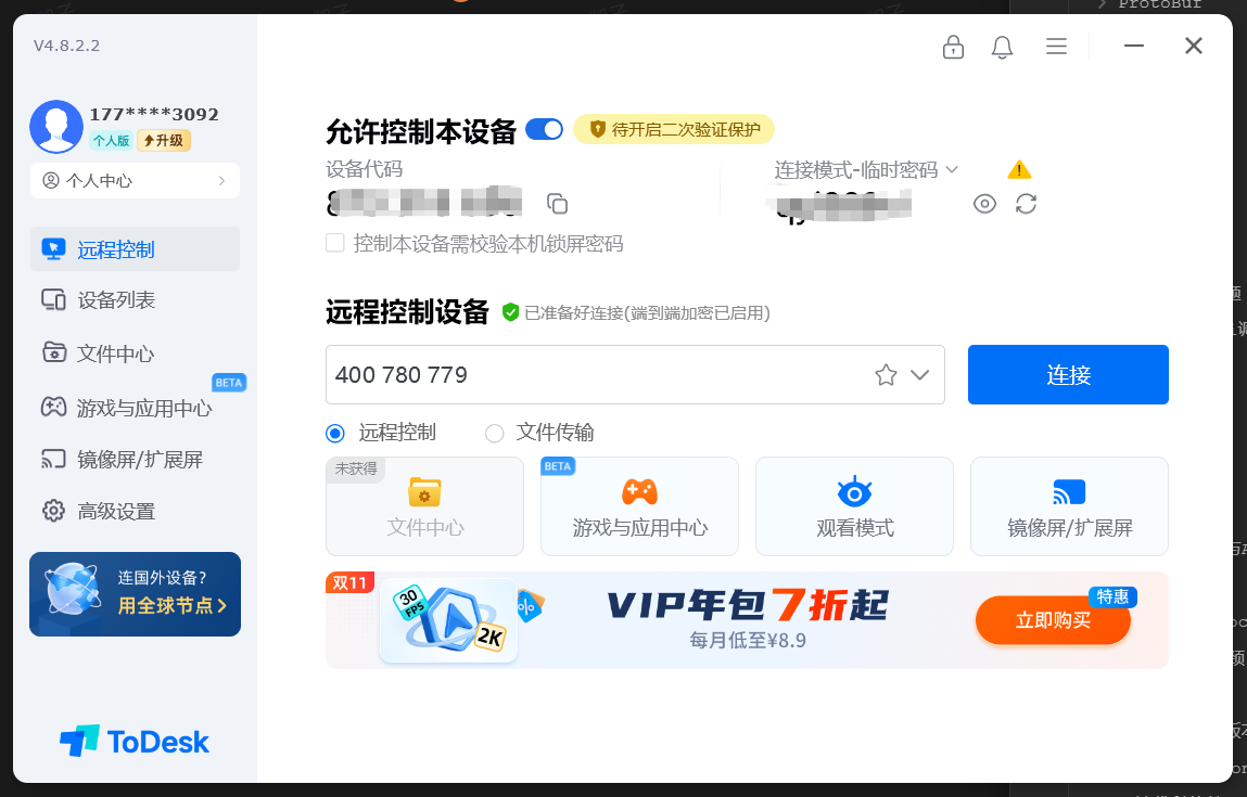 允许控制本机:此区域清晰地展示了本机的核心连接凭证------设备代码和临时密码。设备代码是这台电脑在ToDesk网络中的唯一标识符,固定不变,便于记忆和管理。临时密码则是保障连接安全的第一道防线,每次软件重启或手动刷新后都会自动变更,有效防止了密码泄露带来的未授权访问风险。这种"ID+动态密码"的模式是当前远程控制领域公认的安全标准实践。