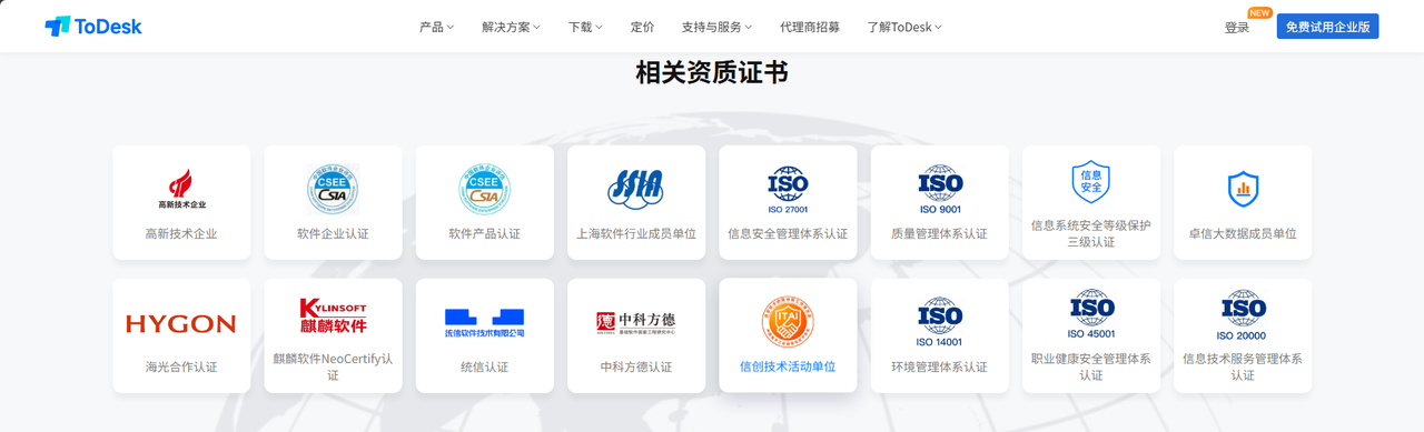安全认证与合规性:ToDesk作为一个商业软件,其产品和服务器部署遵循行业的安全标准和法规要求,例如通过ISO 27001等信息安全管理体系认证。这些第三方权威机构的背书,为ToDesk的安全性提供了客观的证明。