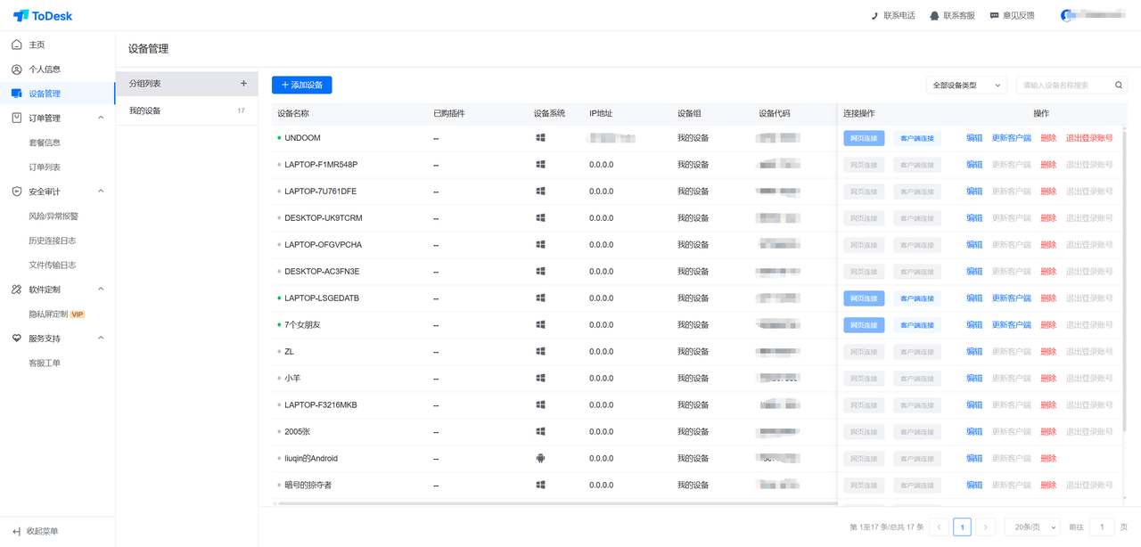 除了功能强大的客户端,ToDesk还提供了一个基于浏览器的Web管理界面,这对于需要管理多台设备的用户,尤其是IT运维人员和企业用户来说,是一个至关重要的功能。
