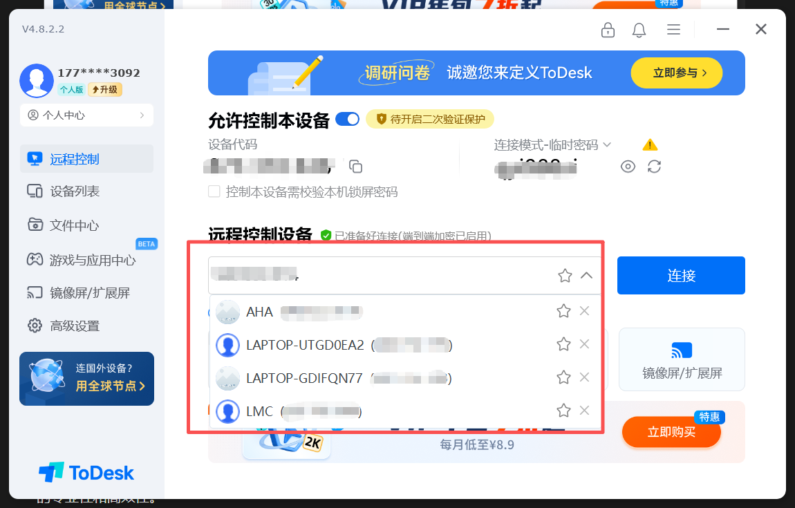 控制其他设备:用户只需在此输入伙伴的设备代码,即可发起连接请求。下方还贴心地设置了"最近连接的设备"列表,对于需要频繁连接固定几台设备的用户而言,这极大地简化了操作流程,省去了反复输入设备代码的麻烦。