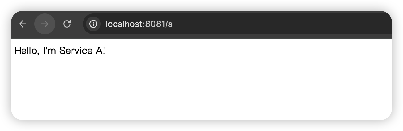 我们编写一个简单的 Flask 服务程序,只要访问 localhost:8081/a 就会返回 "Hello, I'm Service A!" 信息。