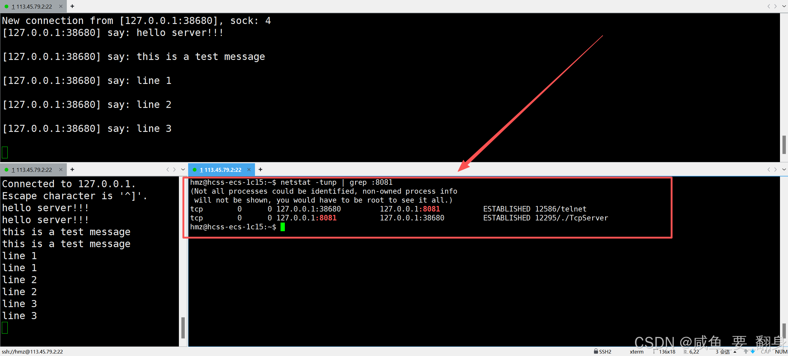 此时我们再开一个新的终端窗口使用netstat命令来查看网络连接状态,如下: