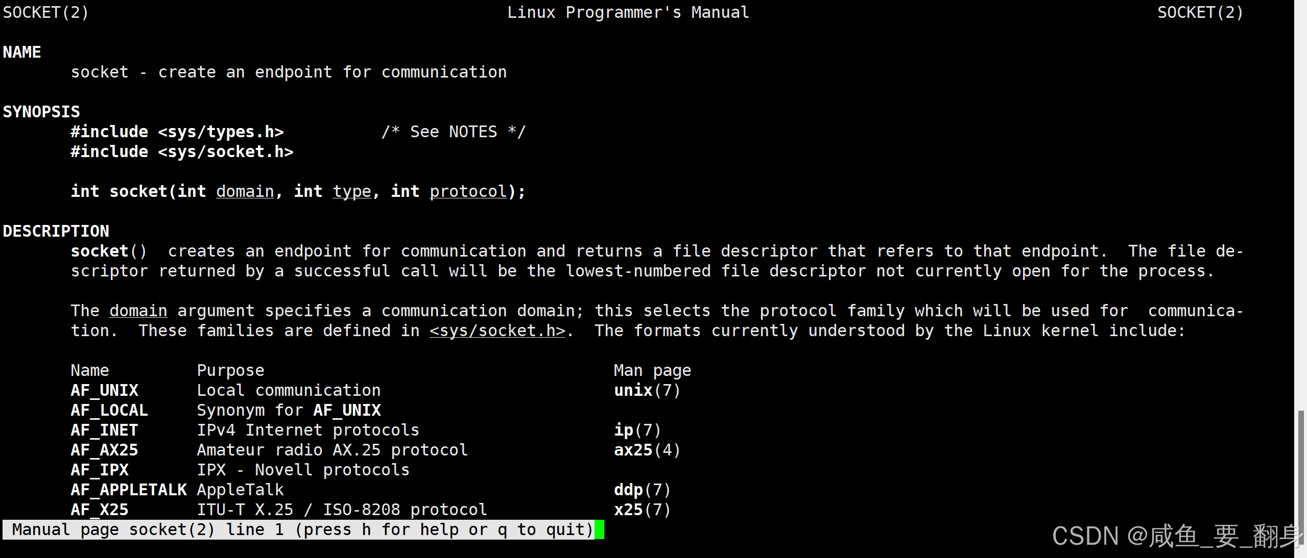 int socket(int domain, int type, int protocol);