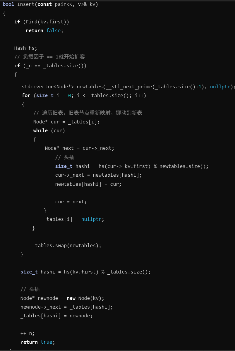 cur->_next = newtables[hashi]; // 新节点的next指向新桶的原有头节点