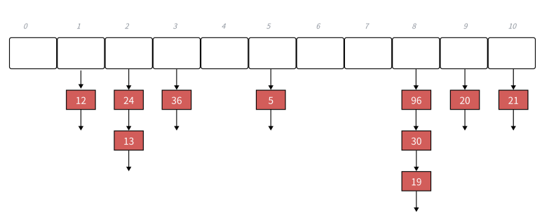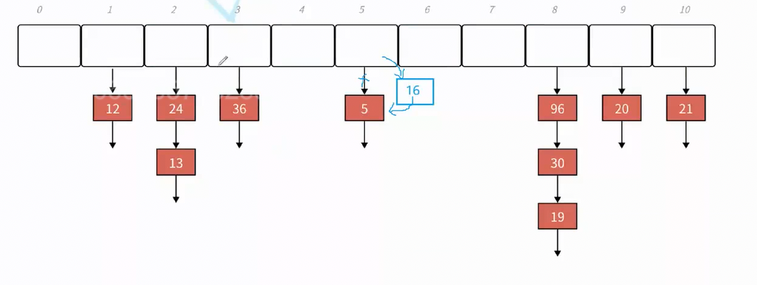 ・下面演示 {19,30,52,63,11,22} 等这一组值映射到 M=11 的表中。