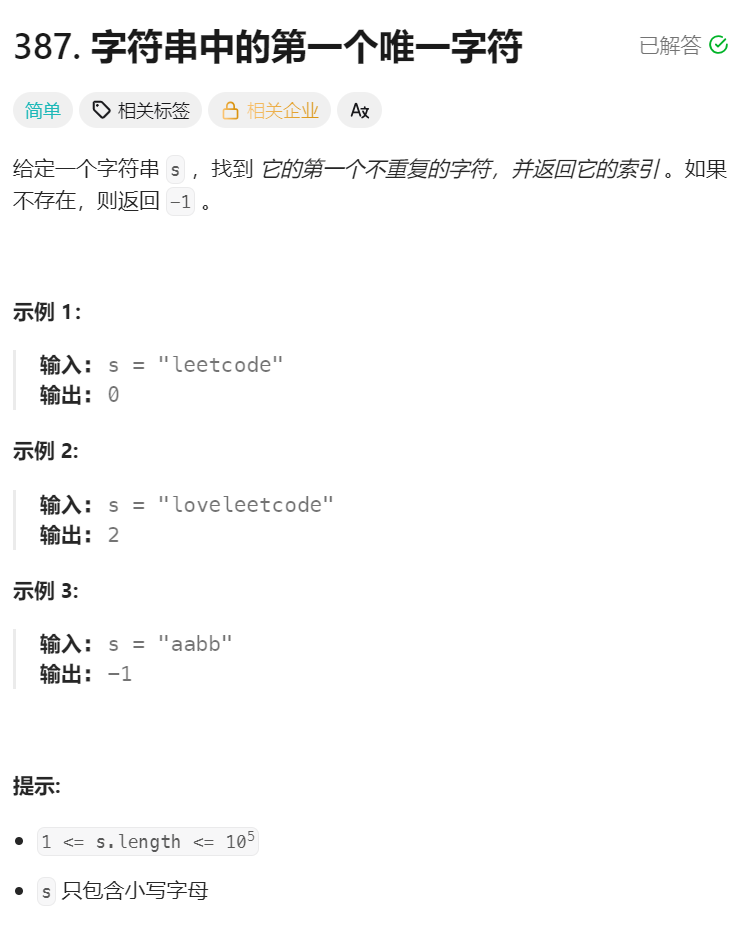 https://leetcode.cn/problems/first-unique-character-in-a-string/description/
