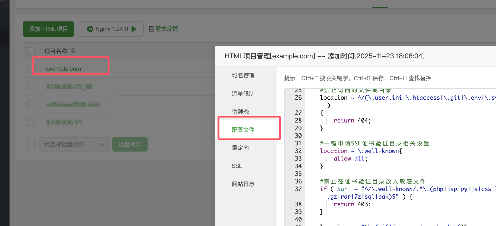 创建完成后点开域名,打开配置文件,根据需要更改配置。