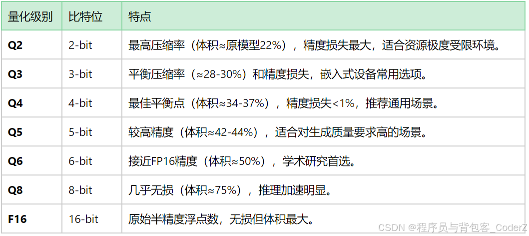 llama.cpp支持多种量化级别,常用的级别如下: