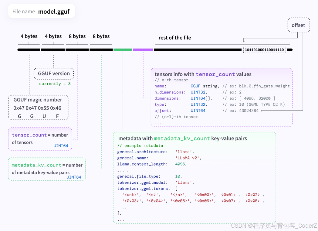 GGUF是在GGML格式的基础上做的优化,GGUF包含了更多的元数据,并且设计上更易于扩展和使用,GGUF格式将权重、分词器和元数据等集成到一个高效的二进制文件中,该二进制文件加载速度快,可跨平台工作。