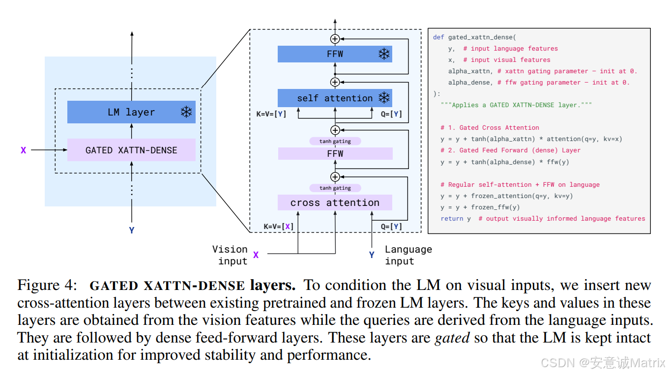 - GATED XATTN-DENSE(门控交叉注意力-密集层):在语言模型的每一层中插入,通过"门控机制"动态控制视觉信息的融入程度,实现视觉与文本特征的渐进式交叉融合。