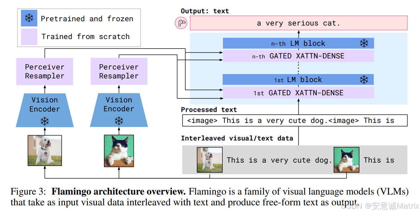 Flamingo的架构是一场视觉与文本的"交响协作",每个模块都承担着独特的"声部"角色。