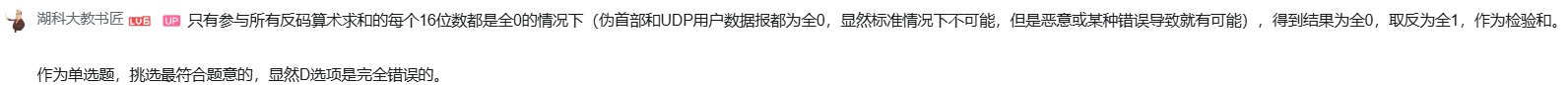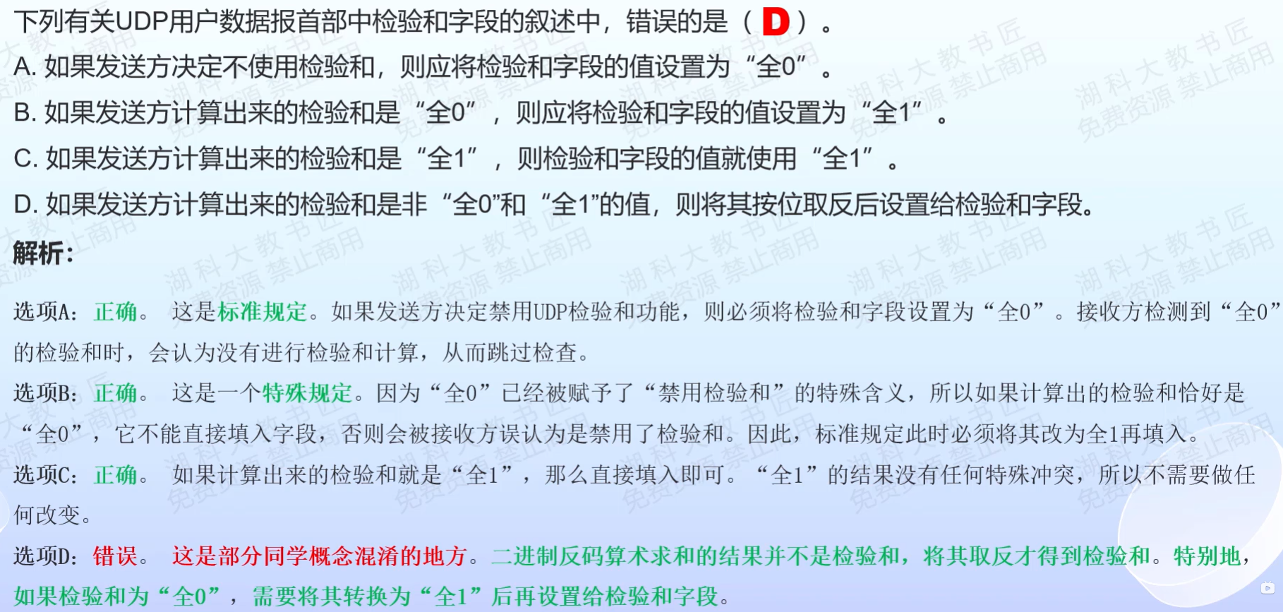 如果发送方决定禁用UDP检验和功能,则必须将检验和字段设置为"全0";接收方检测到"全0"的检验和时,会认为没有进行检验和 计算,从而跳过检查