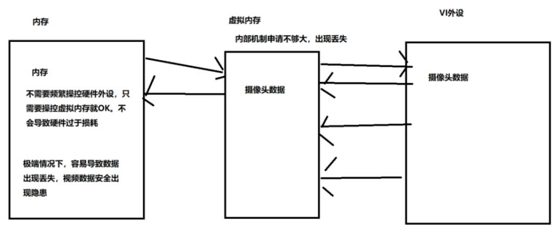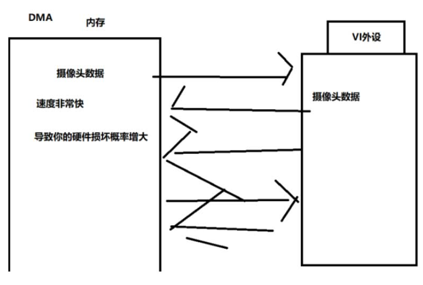 - DMA :指的是直接访问内存的方式,相当于音视频数据直接从硬件传输到内存里面。这种方式的优点就是两边传输的速度非常之快,但缺点就是非常消耗硬件资源,对硬件外设资源要求较高。具体的原理如下图所示: