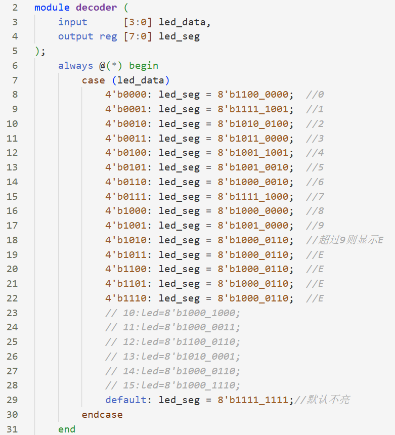 - 2、7段数码管最高1组作为输入错误告警,输入数据>9,则输出E;