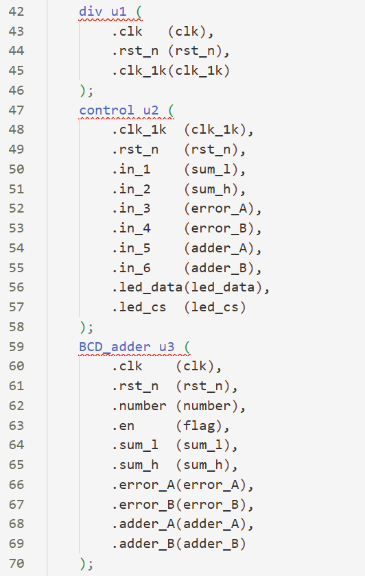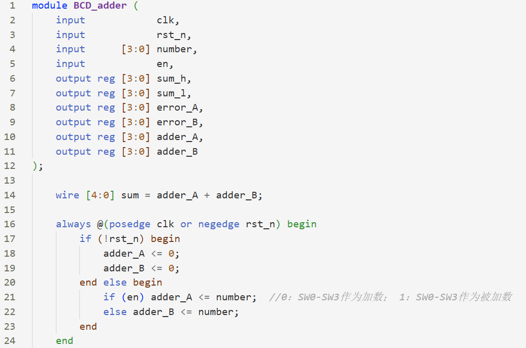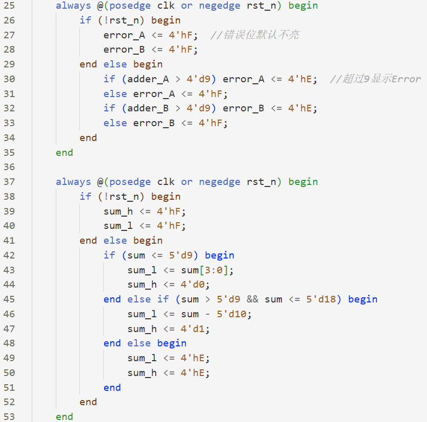BCD加法逻辑如下,如果加数或被加数超过9,则将对应错误位置1,否则不亮;如果sum小于等于9,则直接输出和的低四位,如果sum大于9且小于等于18,则将输出的sum_h置1,将sum减10作为sum_l的输出;如果和大于18,则将sum_l与sum_h标记为Error: