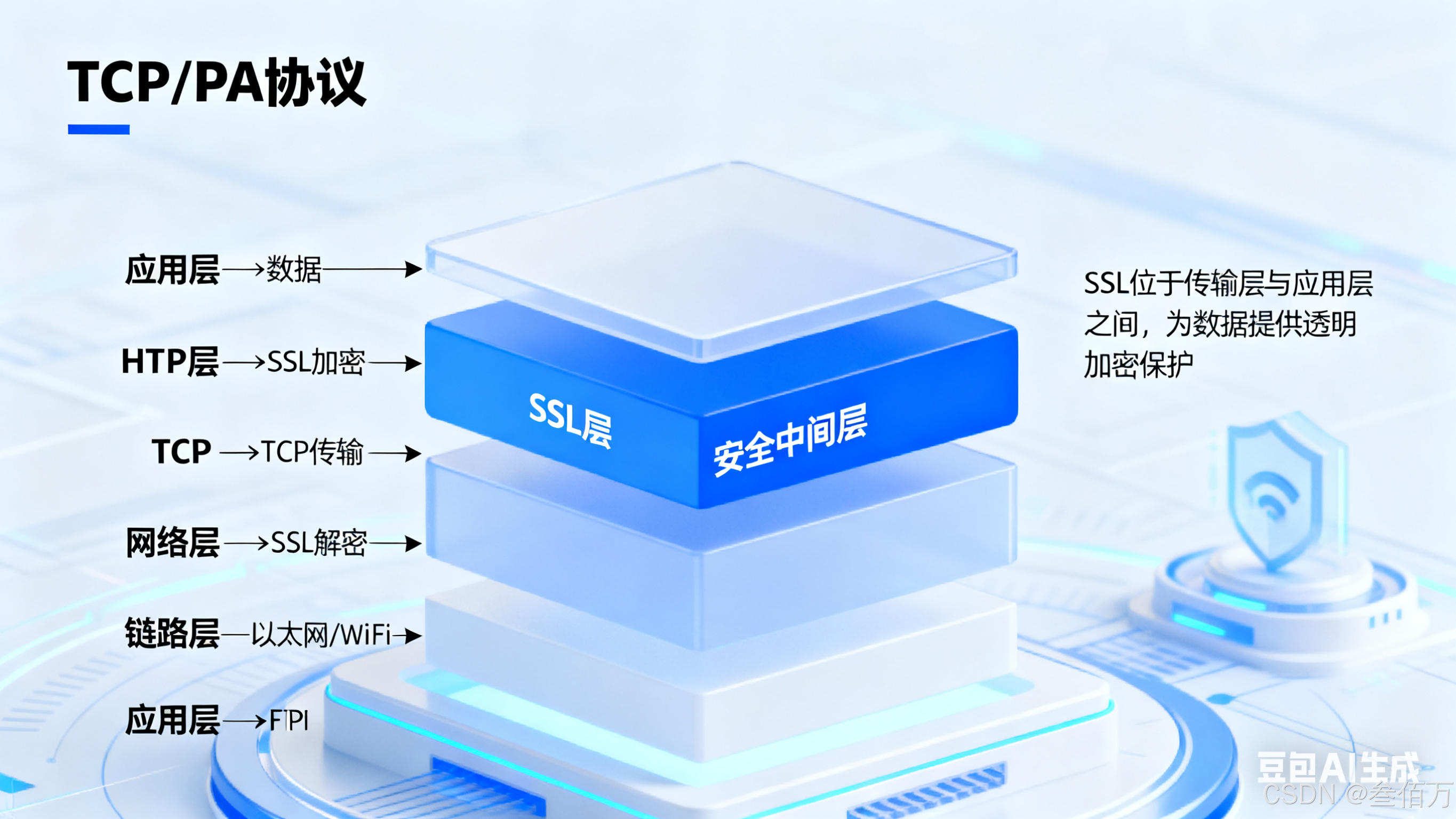 在TCP/IP协议栈中,SSL位于传输层(TCP/UDP)与应用层(HTTP、SMTP、FTP等)之间,形成"安全中间层",其核心作用是对应用层数据进行加密处理后,再交由传输层传输,同时接收传输层数据并解密后提交给应用层。这种层级设计的优势在于: