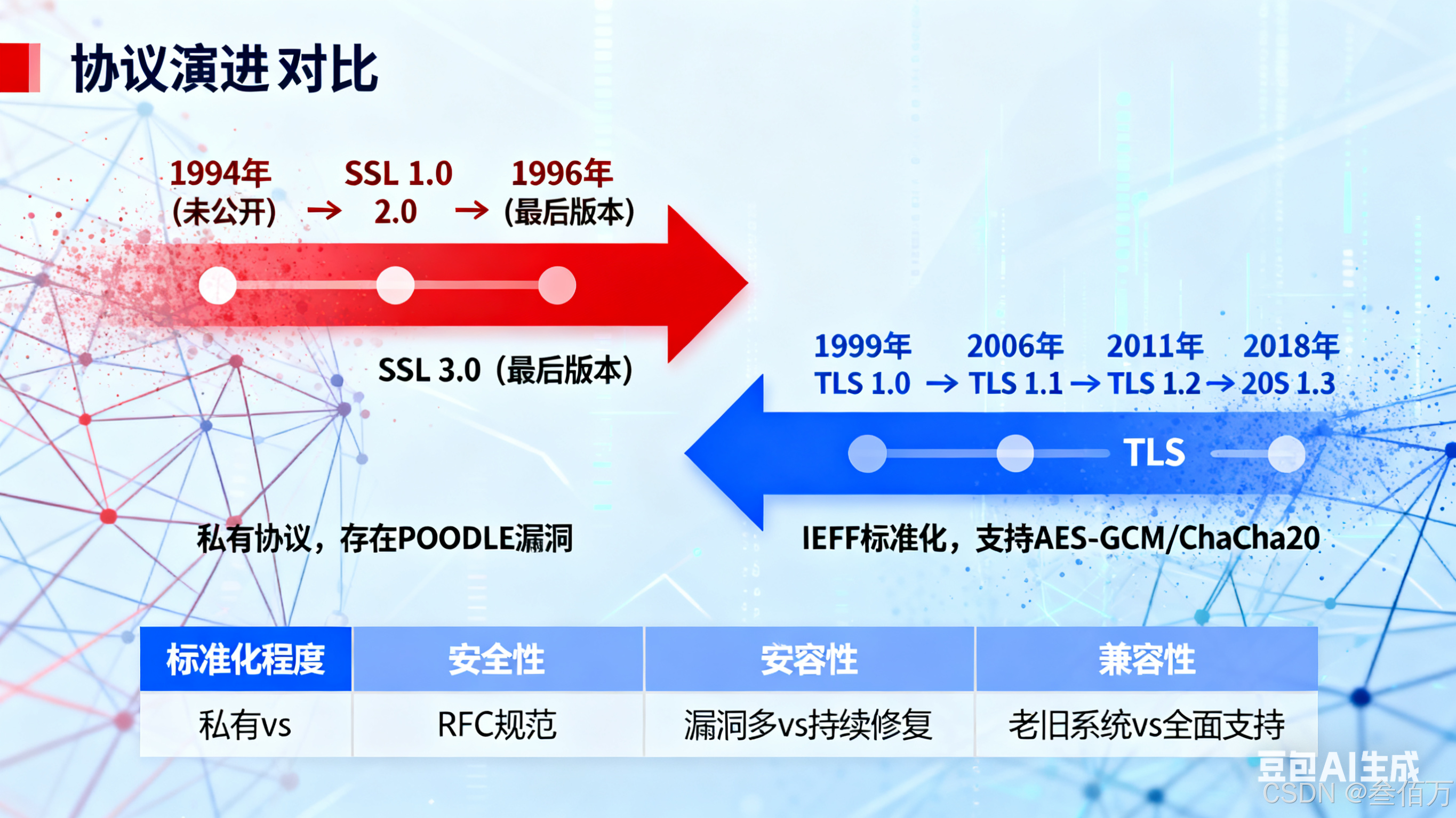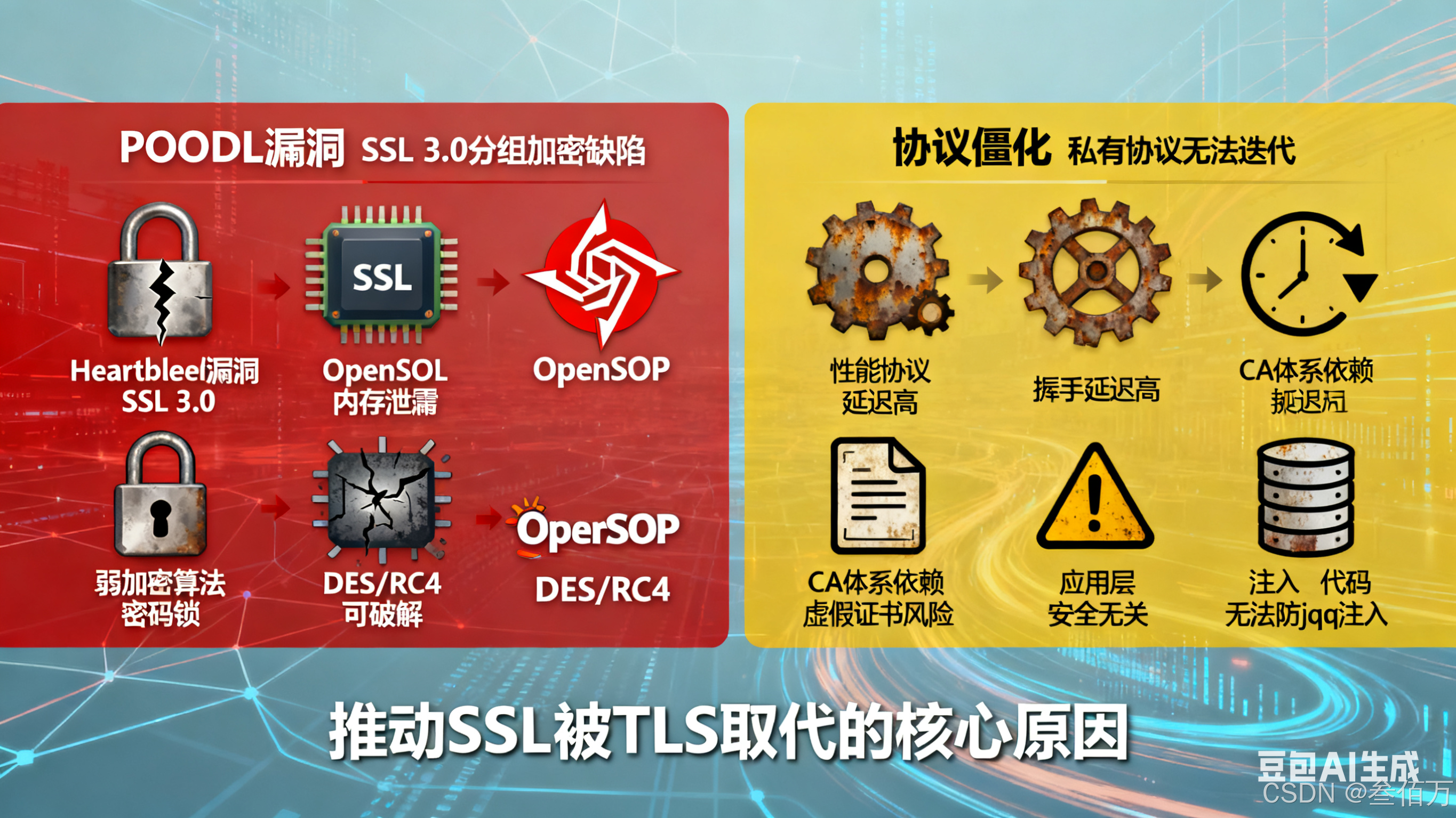 协议僵化:SSL是私有协议,网景公司停止更新后,无法快速响应新的安全威胁,而TLS作为标准化协议,可通过IETF快速迭代修复漏洞。