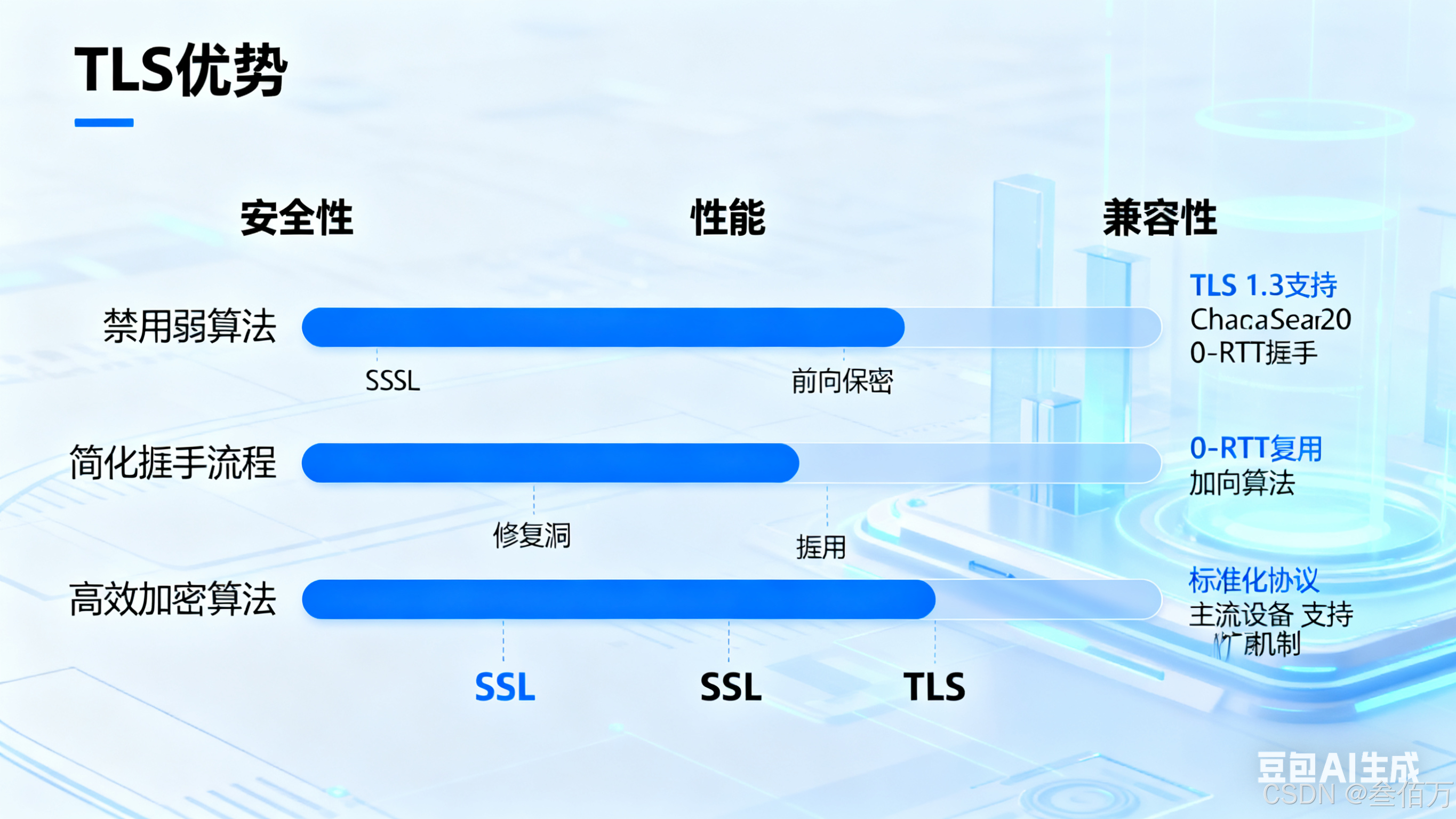 TLS作为SSL的标准化替代方案,在保留SSL核心安全机制的基础上,进行了全面的优化和升级,尤其是TLS 1.3,已成为当前安全传输的主流协议。