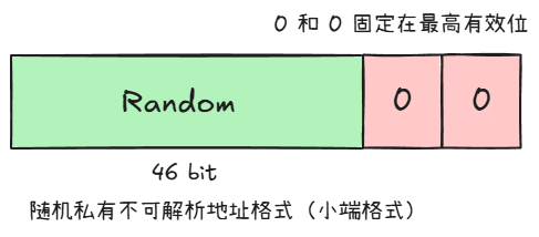 - 为了避免无效地址,核心规范要求除高两位外,剩余的46位随机部分不得全为0,也不得全为1 。