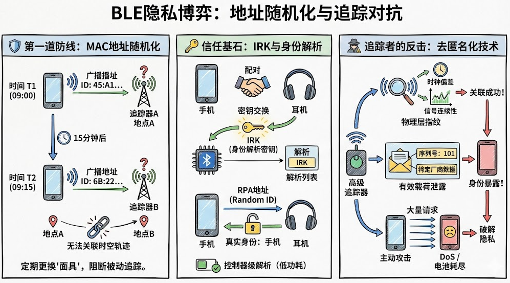 本小节主要包括:1)MAC地址随机变化,定期更换面具,阻断被动跟踪;2)IRK与身份解析,这是信任的基石;3)追踪者的反击(破解):去匿名化技术。