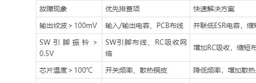根因:驱动电阻过大导致开关速度慢;或SW引脚布线过长,寄生电感引发振荡。