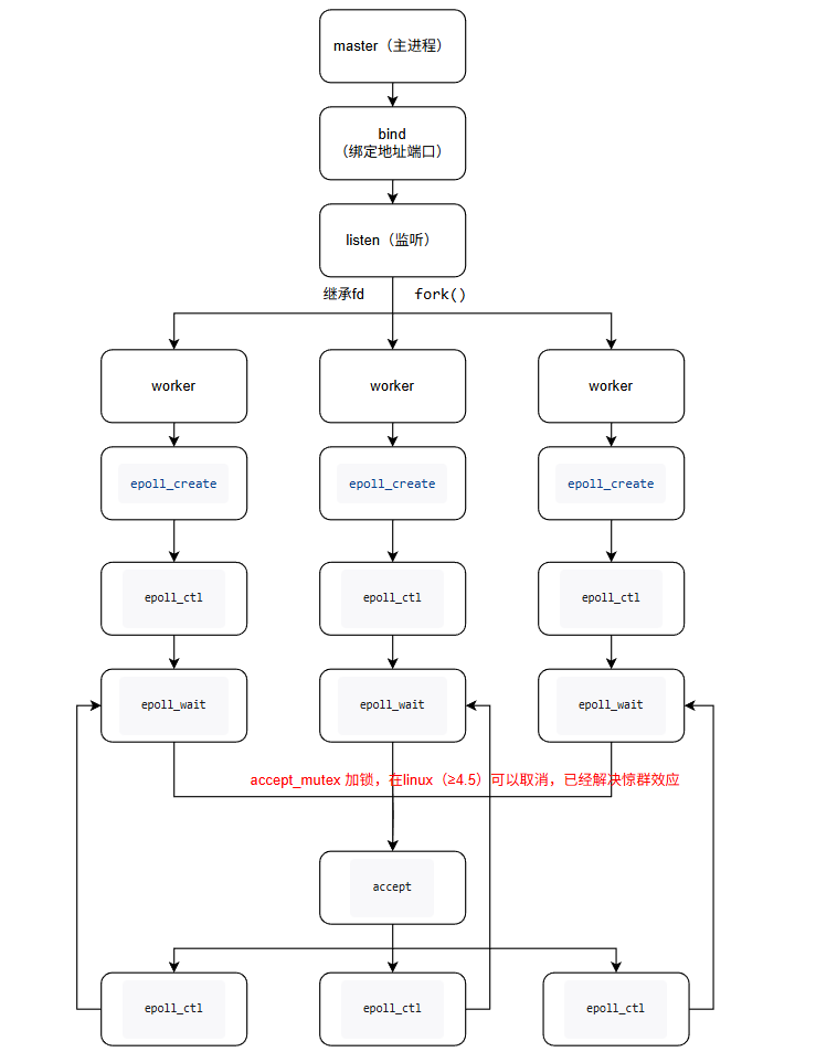 accept_mutex on(旧版默认),仅一个 Worker 能抢到互斥锁并调用accept(); - 若启用