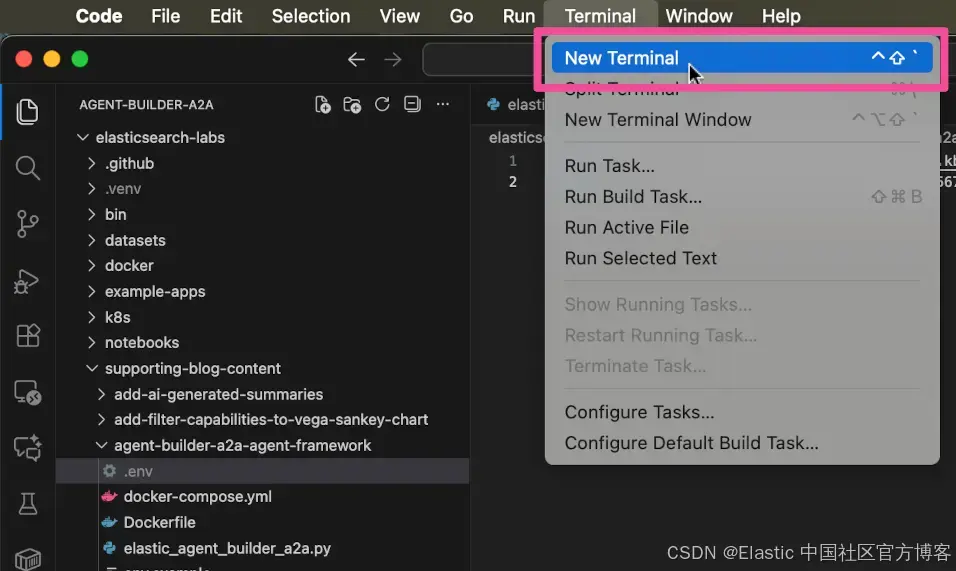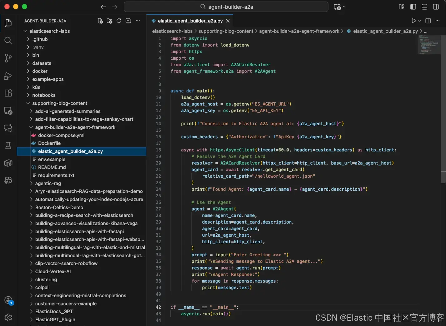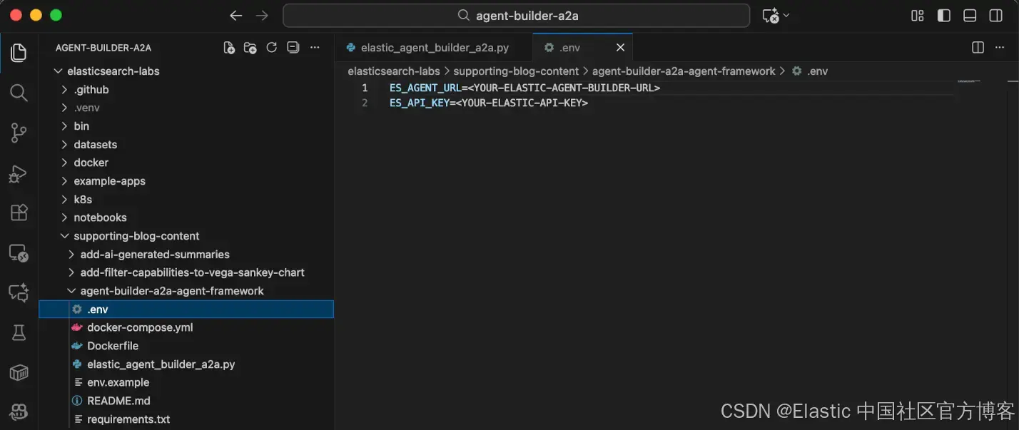 在 Visual Studio 文件资源管理器中,展开 supporting-blog-content 和 agent-builder-a2a-agent-framework 文件夹,然后在文本编辑器中打开名为 elastic_agent_builder_a2a.py 的文件。
