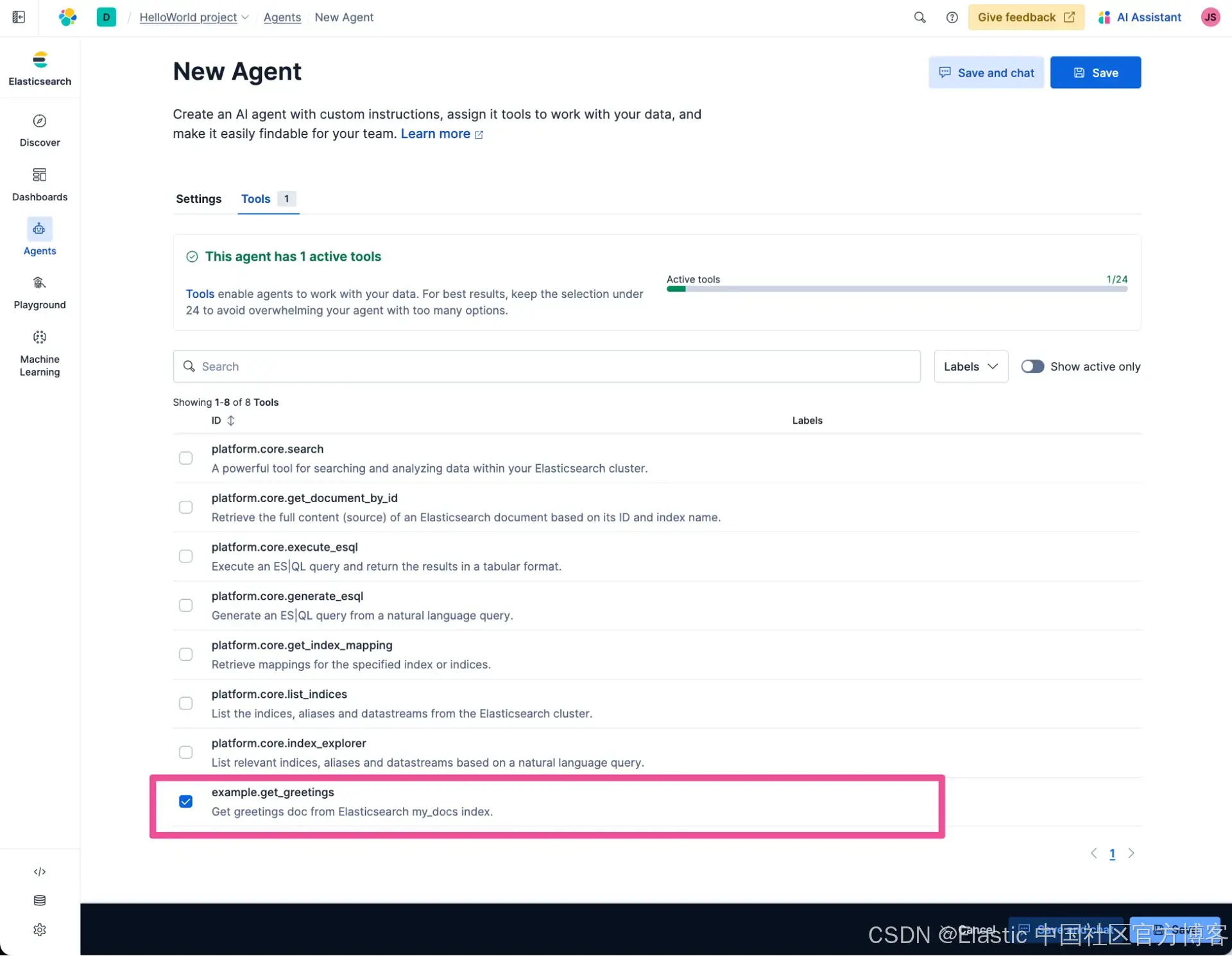 只选择我们之前创建的 example.get_greetings tool。取消选择所有其他可用的 tools。这将配置正在创建的 agent 仅能访问我们创建的 tool。