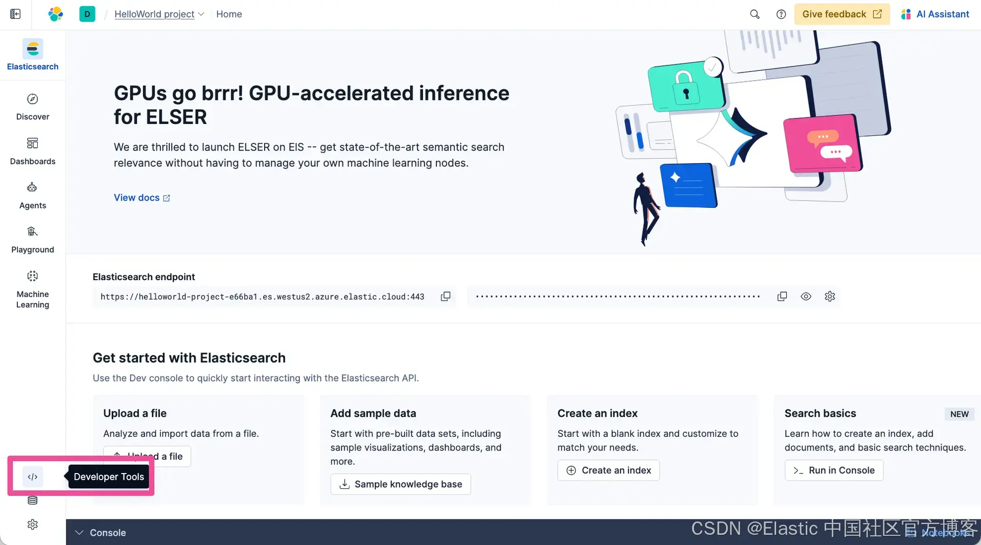 现在我们已经有了一个 Elastic 项目,让我们创建一个索引,这是 Elasticsearch 用来存储数据的地方。打开 Elastic Cloud 中的 Developer Tools,我们可以在这里运行命令来创建一个索引。