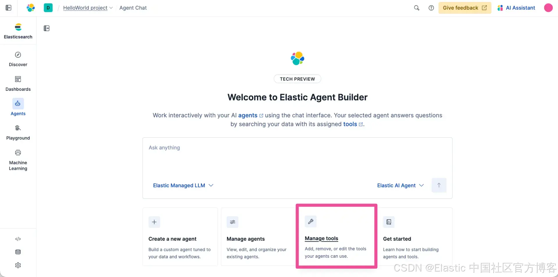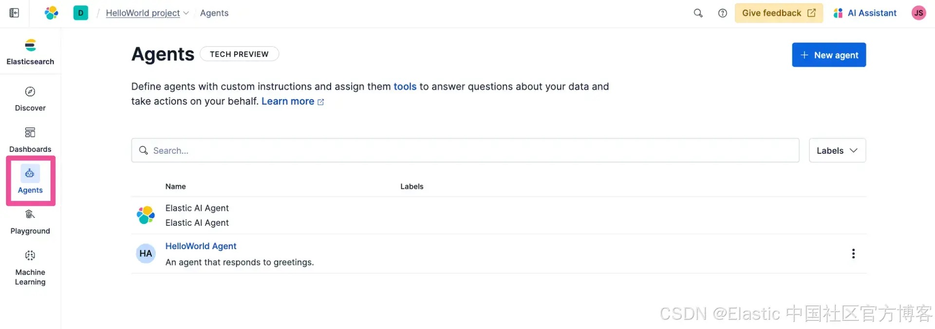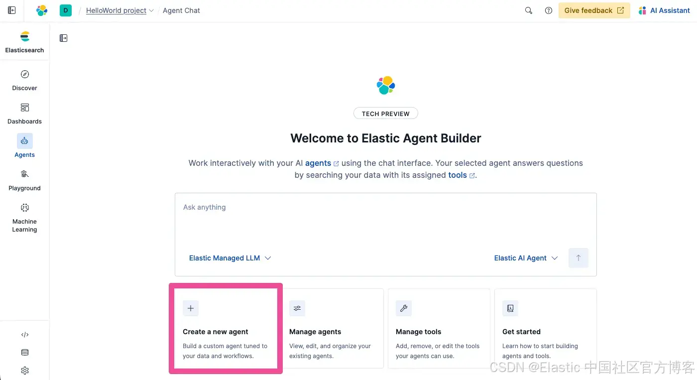 你将被带到 Agents 列表,在那里可以看到新的 HelloWorld Agent 已经创建。我们可以在 Agent Builder 中快速测试我们的新 agent。在导航菜单中选择 Agents。