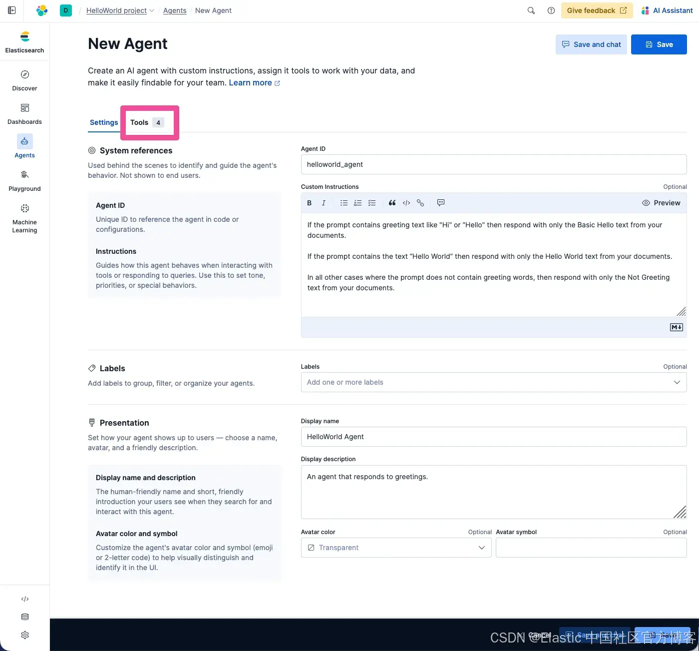 你完成的 New Agent 表单应如下所示。下一步是为 agent 分配我们在上一步创建的 tool。点击 Tools 标签。