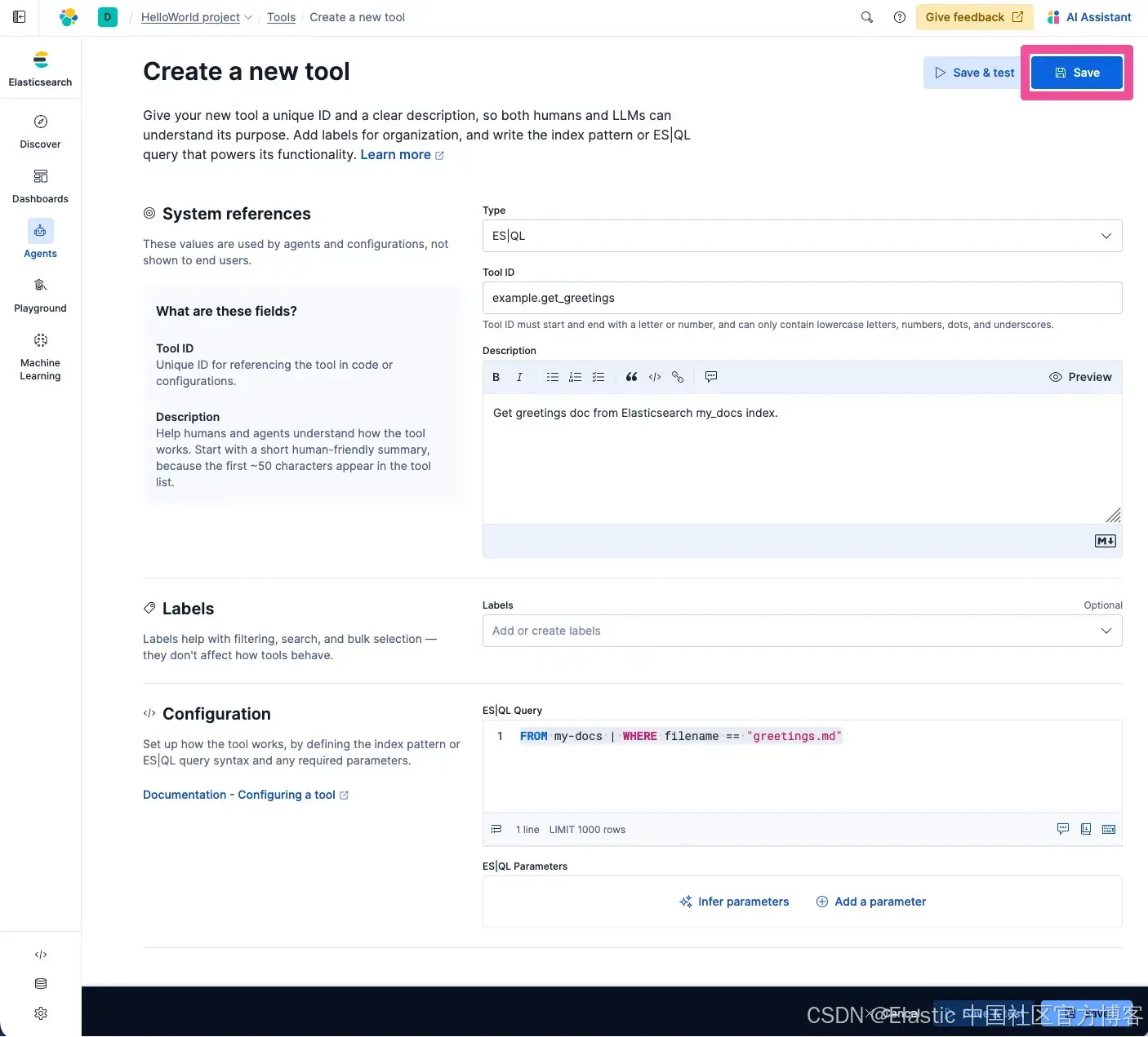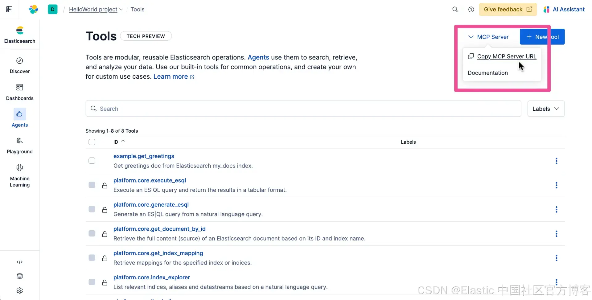首先,我们将 替换为你可以从 Elastic 项目中的 Agent Builder - Tools 页面复制的 Agent URL 路径。回到 Elastic Agent Builder,在导航菜单中点击 Agents。