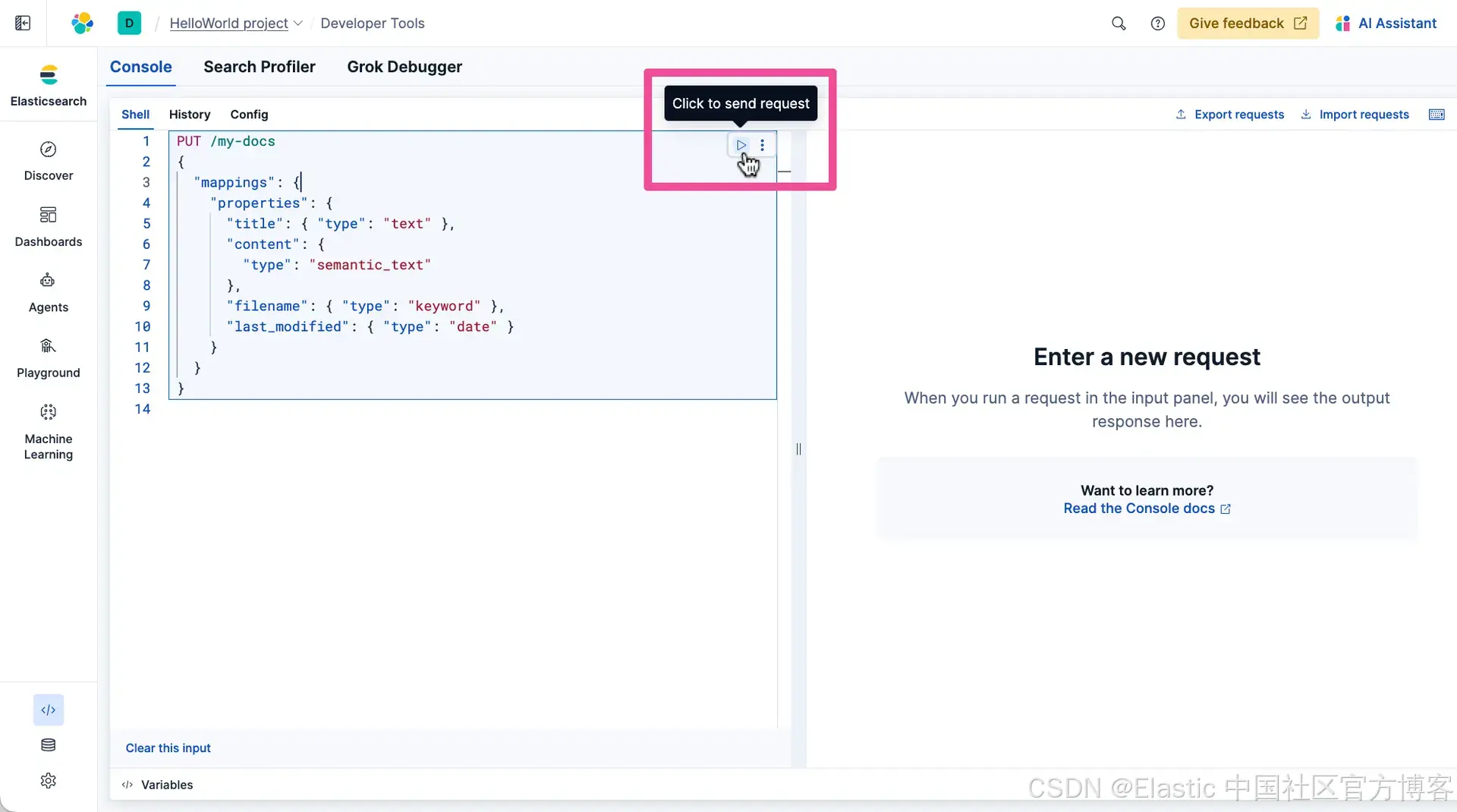复制下面的 PUT 命令,它会创建一个名为 my-docs 的索引,包含多种字段,以及利用语义搜索的内容。