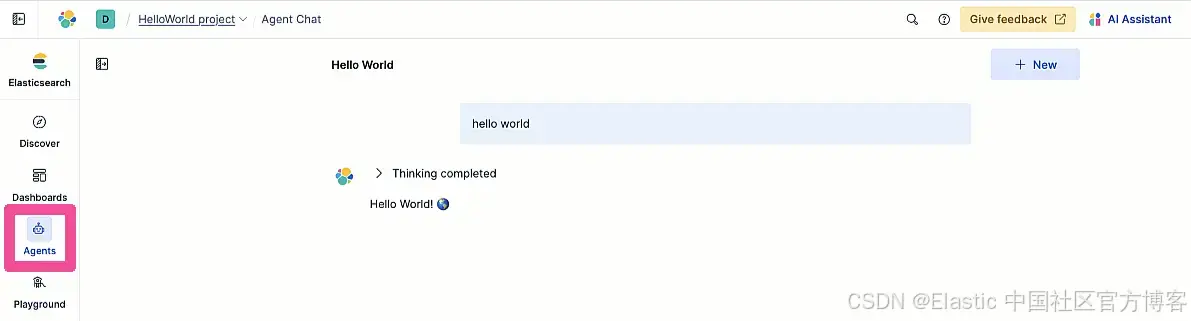 在 Agent Chat agent 选择器中选择 HelloWorld Agent。输入提示 "hello world",你应该会从存储在 my-docs Elastic 索引中的 greetings.md 文档中得到 Hello World 文本。